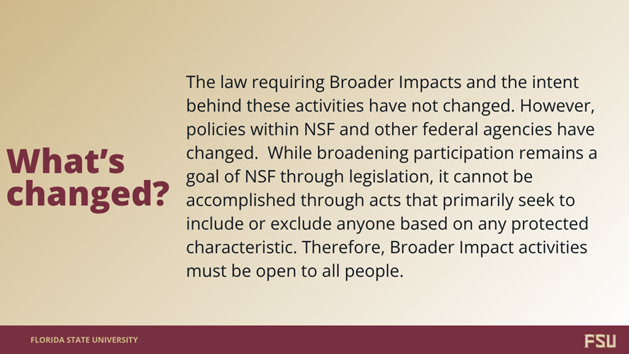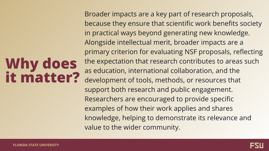 When science engages directly with communities, it underscores the relevance of research and its real-world impact. Because this connection is so vital, funders like the National Science Foundation (NSF) require research proposals to show how they will benefit society, not just advance scientific understanding. For many researchers, this represents a shift in perspective, often calling for new types of collaborations and support during the proposal-writing process. Keep reading for a brief overview of Broader Impacts for NSF, or click here for a deeper dive and learn how Research Development can help FSU researchers craft high-quality Broader Impact plans.